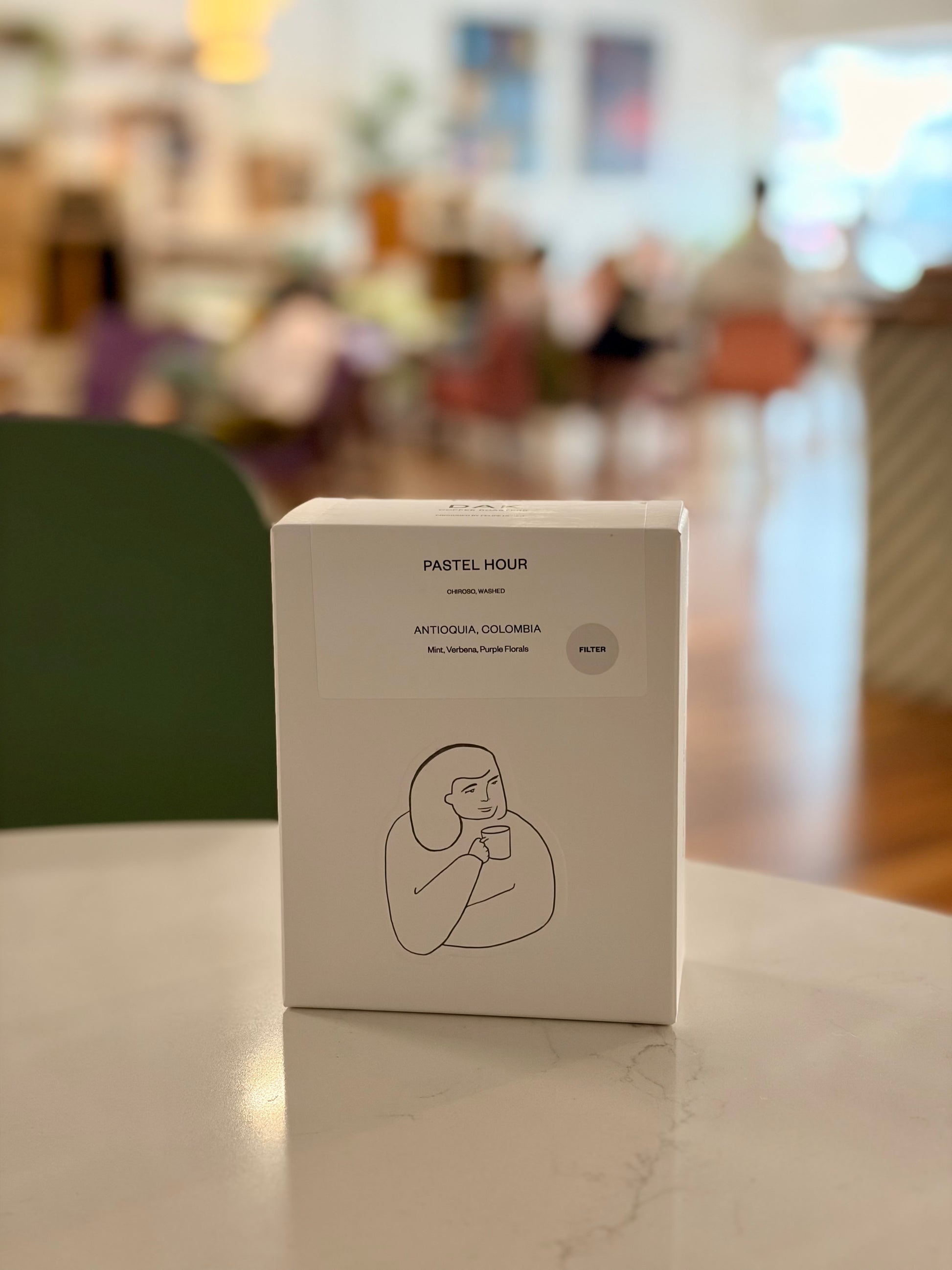 Pastel Hour is a Chiroso washed from Finca Los Tres Mosqueteros in Antioquia. This lot undergoes a multi-day layered fermentation, where each day’s harvest is added to the same tanks before being washed and dried slowly in solar parabolic dryers. This process builds aromatic depth and sweetness while keeping the cup very clear. Tasting notes of mint, verbena, and purple florals.